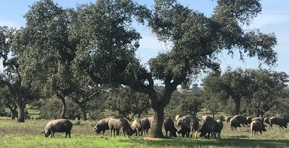Encinas, alcornoques, robles y quejigos poblan las dehesas donde caminan nuestros cerdos a sus anchas, alimentándose de su fruto, la bellota. Las razas ibéricas puras son las que mejor se adaptan a la dehesa y a sus recursos de espacio libre y de nutrientes naturales: agua de los arroyos, bellotas y hierbas.